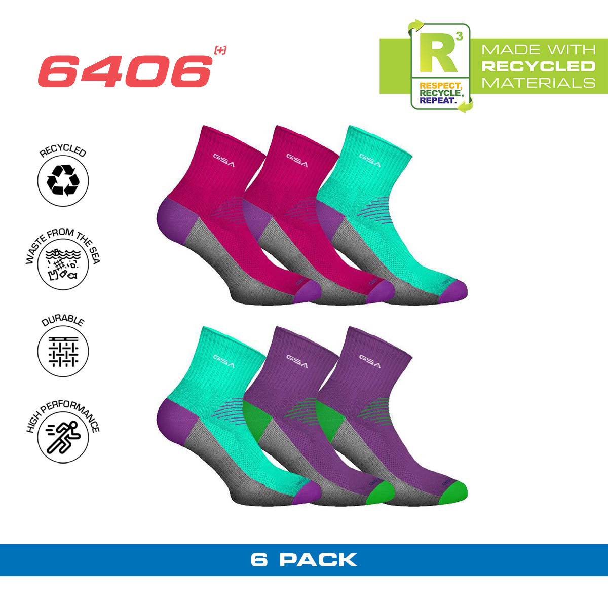 GSA HYDRO[+] 6406 Women’s Extra Cushioned High Performance Quarter Recycled Socks / 6Pack