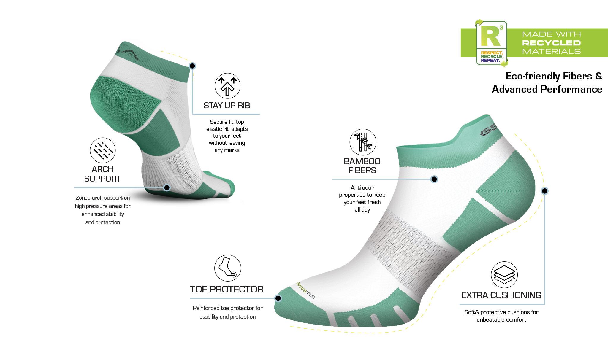 Οι βιώσιμες τεχνικές κάλτσες GSABAMBOO[+] ήρθαν για να συμπληρώσουν την συλλογή καλτσών κάθε αθλητή. Ο συνδυασμός ανακυκλωμένων υλικών και αθλητικών τεχνικών χαρακτηριστικών, τις καθιστούν την ιδανική επιλογή για τον απαιτητικό αθλητή που αναζητά μια λύση κορυφαίας ποιότητας για την προπόνησή του.