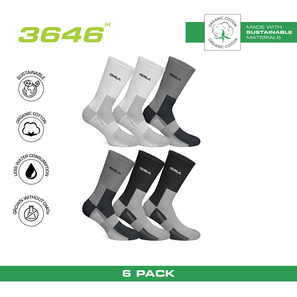 GSA ORGANICPLUS[+] 3646 Men’s Fully Cushioned Performance Crew Eco-friendly Socks / 6Pack